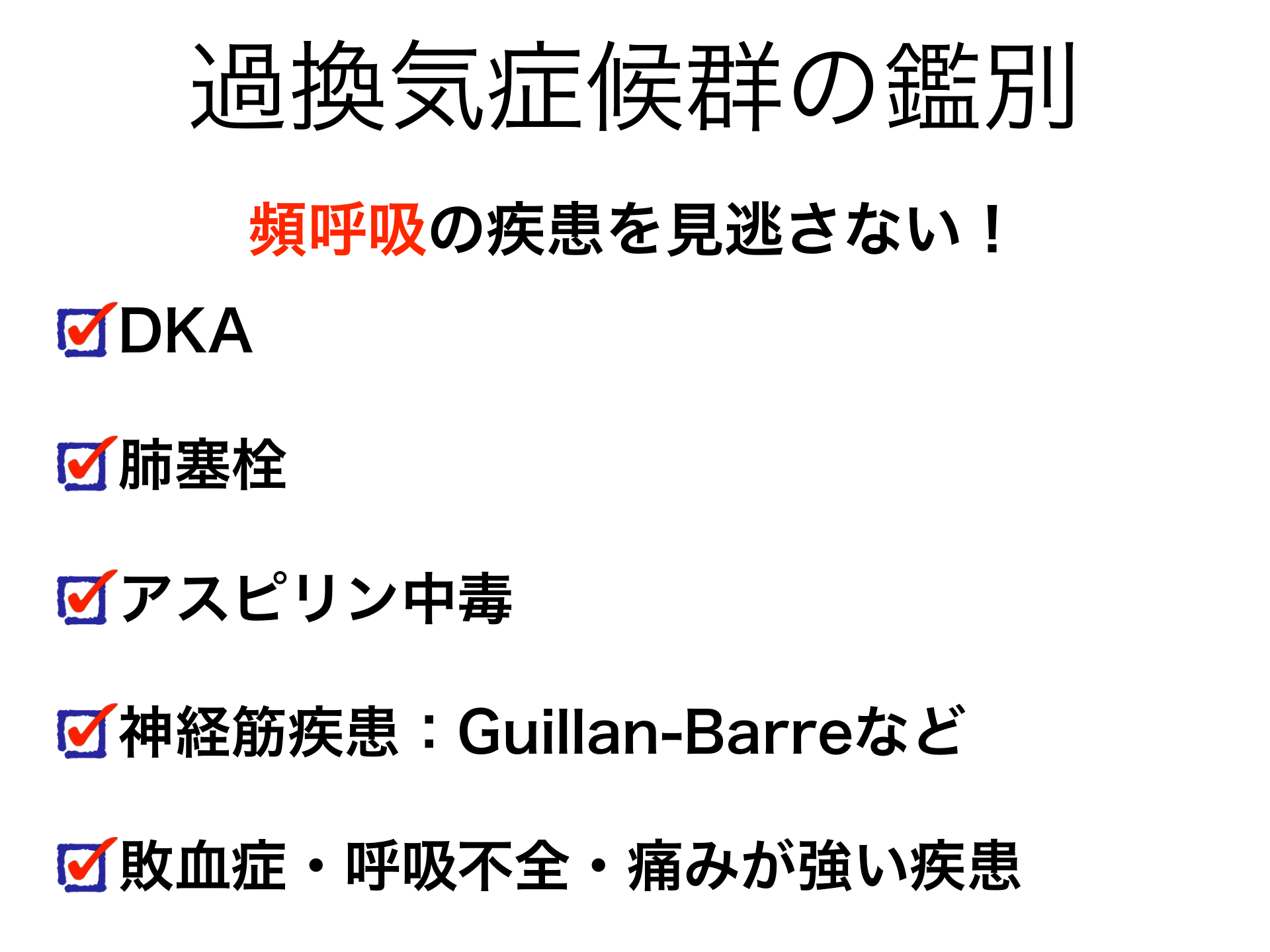 #19. 過換気症候群の鑑別 頻呼吸の疾患を見逃さない! DKA 肺塞栓 アスピリン中毒 神経筋疾患:Guillan-Barreなど 敗血症・呼吸不全・痛みが強い疾患