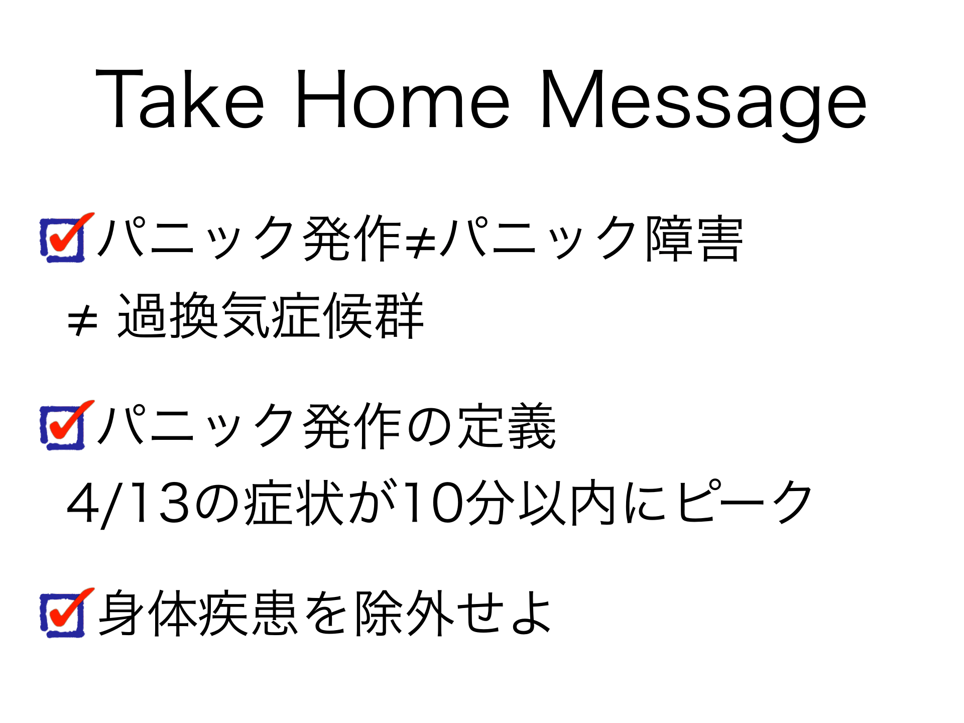 #20. Take Home Message パニック発作 パニック障害 過換気症候群 パニック発作の定義 4/13の症状が10分以内にピーク 身体疾患を除外せよ