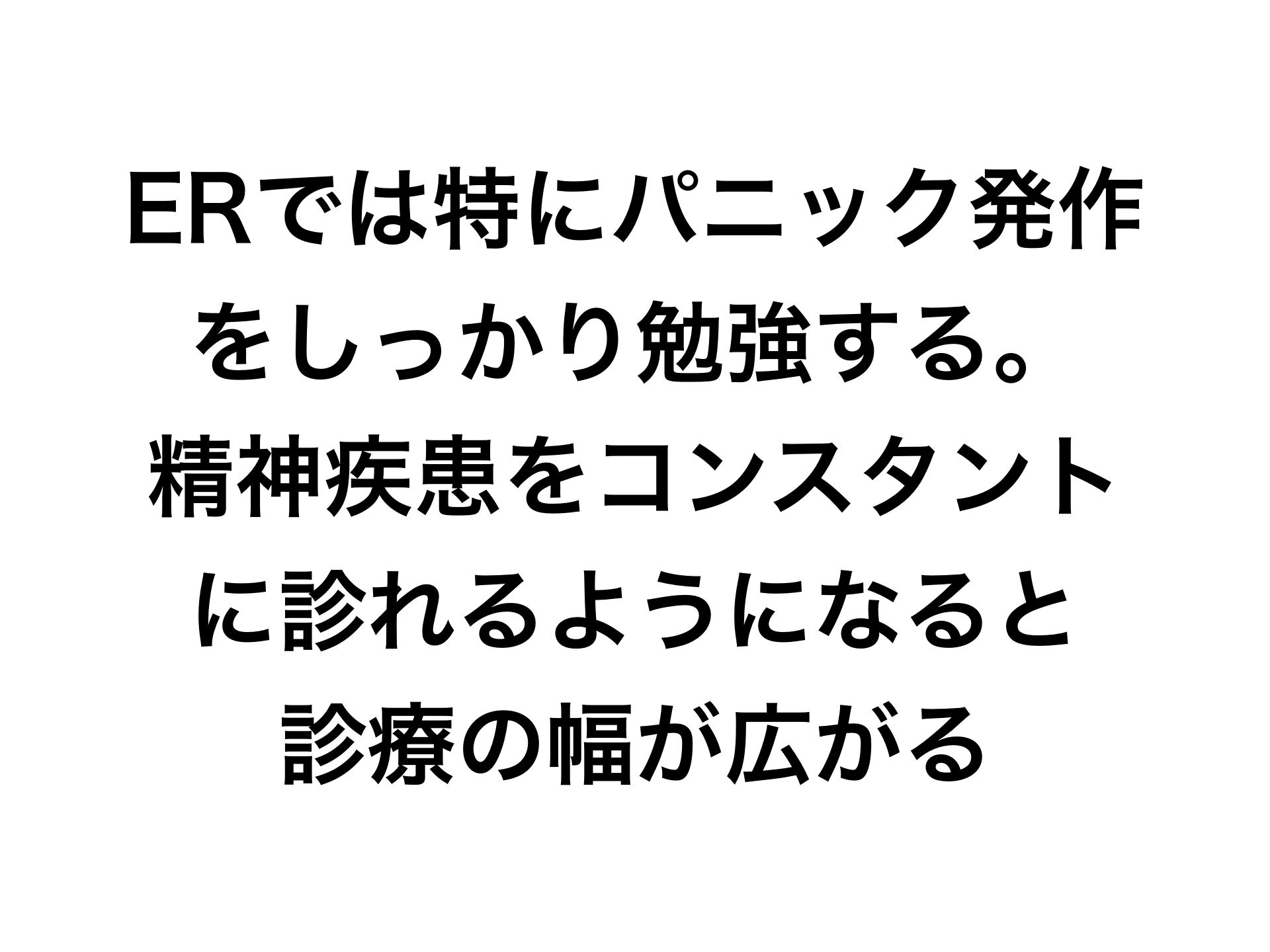 #21. ERでは特にパニック発作 をしっかり勉強する。 精神疾患をコンスタント に診れるようになると 診療の幅が広がる