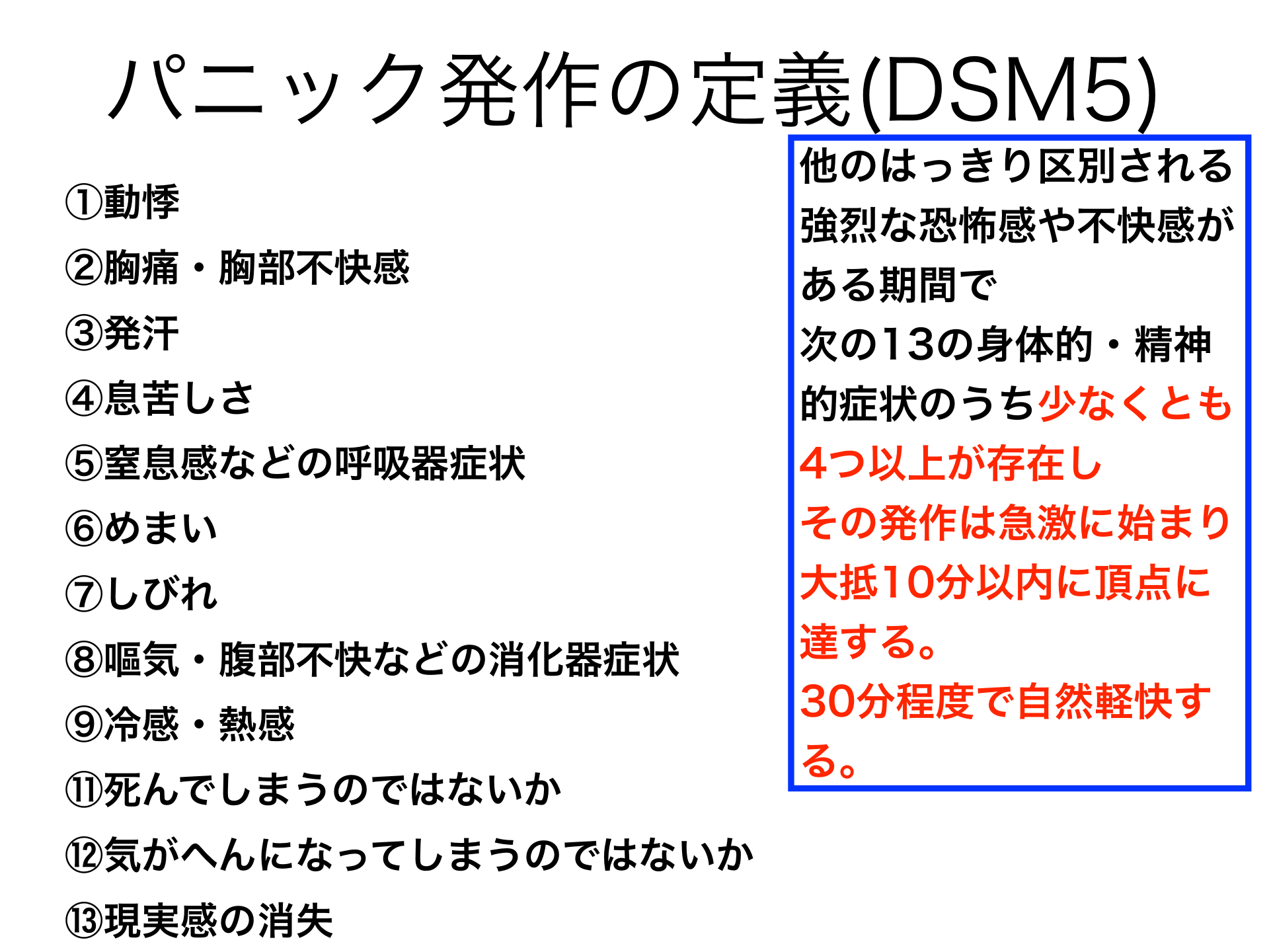 #4. パニック発作の定義(DSM5) ①動悸 ②胸痛・胸部不快感 ③発汗 ④息苦しさ ⑤窒息感などの呼吸器症状 ⑥めまい ⑦しびれ ⑧嘔気・腹部不快などの消化器症状 ⑨冷感・熱感 ⑪死んでしまうのではないか ⑫気がへんになってしまうのではないか ⑬現実感の消失 他のはっきり区別される 強烈な恐怖感や不快感が ある期間で 次の13の身体的・精神 的症状のうち少なくとも 4つ以上が存在し その発作は急激に始まり 大抵10分以内に頂点に 達する。 30分程度で自然軽快す る。