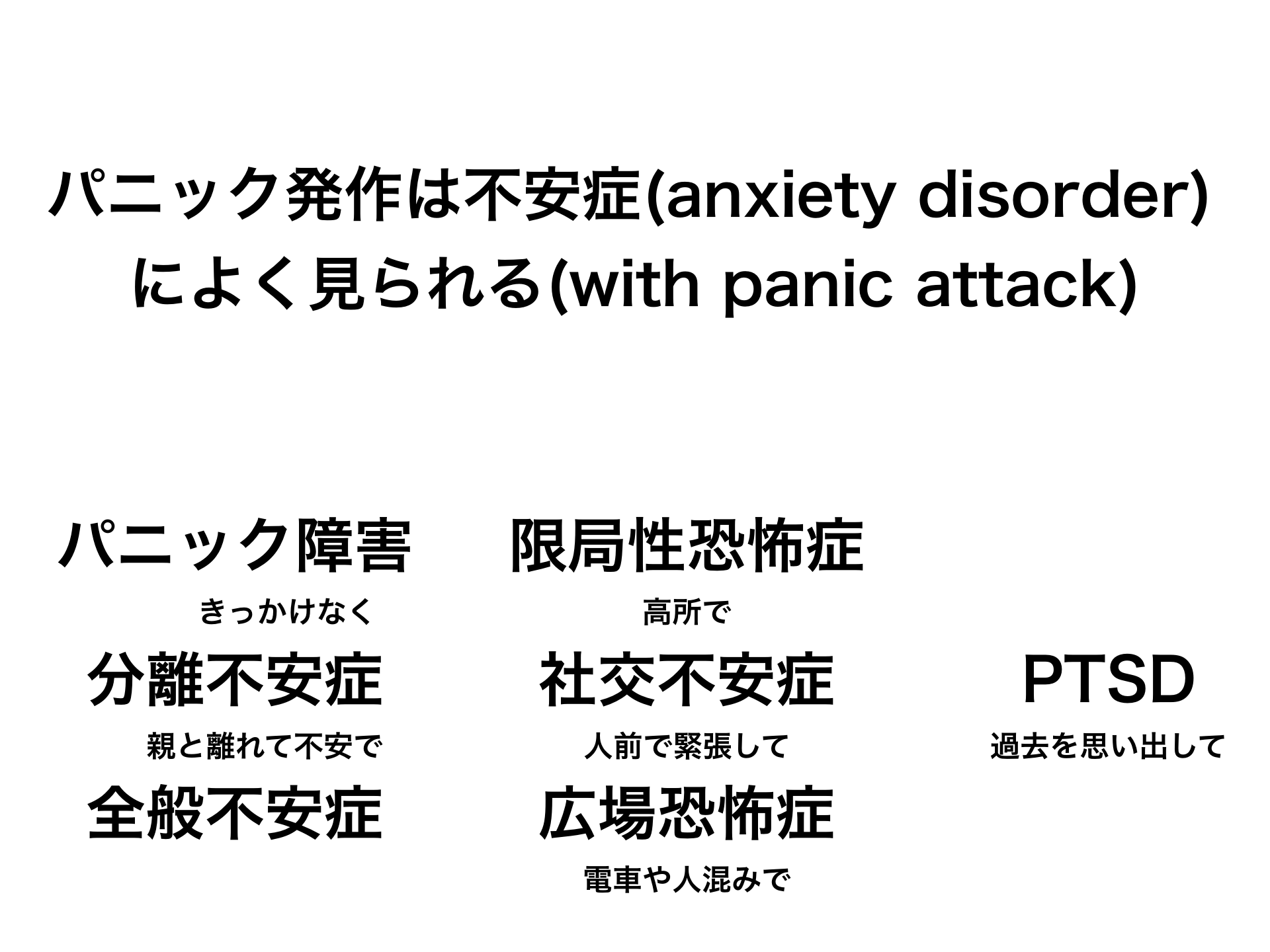 #6. パニック発作は不安症(anxiety disorder) によく見られる(with panic attack) パニック障害 限局性恐怖症 分離不安症 社交不安症 全般不安症 広場恐怖症 きっかけなく 親と離れて不安で 高所で 人前で緊張して 電車や人混みで PTSD 過去を思い出して