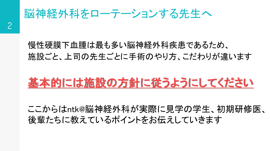 #2. 脳神経外科をローテーションする先生へ 2 慢性硬膜下血腫は最も多い脳神経外科疾患であるため、 施設ごと、上司の先生ごとに手術のやり方、こだわりが違います 基本的には施設の方針に従うようにしてください ここからはntk@脳神経外科が実際に見学の学生、初期研修医、 後輩たちに教えているポイントをお伝えしていきます