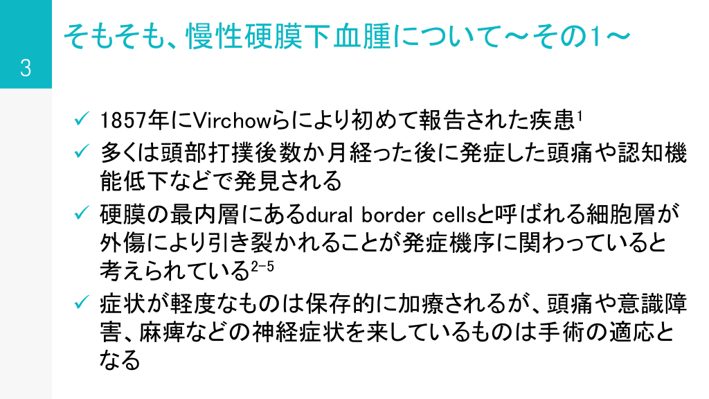 #3. そもそも、慢性硬膜下血腫について~その1~ 3 ✓ 1857年にVirchowらにより初めて報告された疾患1 ✓ 多くは頭部打撲後数か月経った後に発症した頭痛や認知機 能低下などで発見される ✓ 硬膜の最内層にあるdural border cellsと呼ばれる細胞層が 外傷により引き裂かれることが発症機序に関わっていると 考えられている2-5 ✓ 症状が軽度なものは保存的に加療されるが、頭痛や意識障 害、麻痺などの神経症状を来しているものは手術の適応と なる