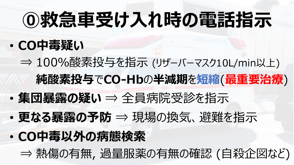 #10. ⓪救急⾞受け⼊れ時の電話指⽰ • CO中毒疑い ⇒ 100%酸素投与を指⽰ (リザーバーマスク10L/min以上) 純酸素投与でCO-Hbの半減期を短縮(最重要治療) • 集団暴露の疑い ⇒ 全員病院受診を指⽰ • 更なる暴露の予防 ⇒ 現場の換気、避難を指⽰ • CO中毒以外の病態検索 ⇒ 熱傷の有無, 過量服薬の有無の確認 (⾃殺企図など)