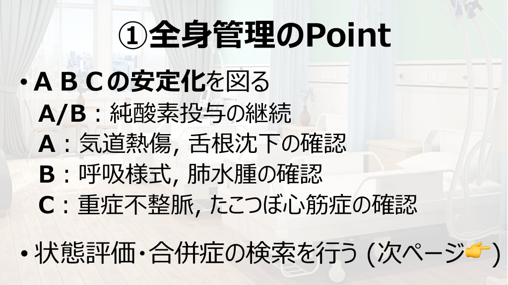 #11. ①全⾝管理のPoint •ABCの安定化を図る A/B︓純酸素投与の継続 A︓気道熱傷, ⾆根沈下の確認 B︓呼吸様式, 肺⽔腫の確認 C︓重症不整脈, たこつぼ⼼筋症の確認 • 状態評価・合併症の検索を⾏う (次ページ👉)