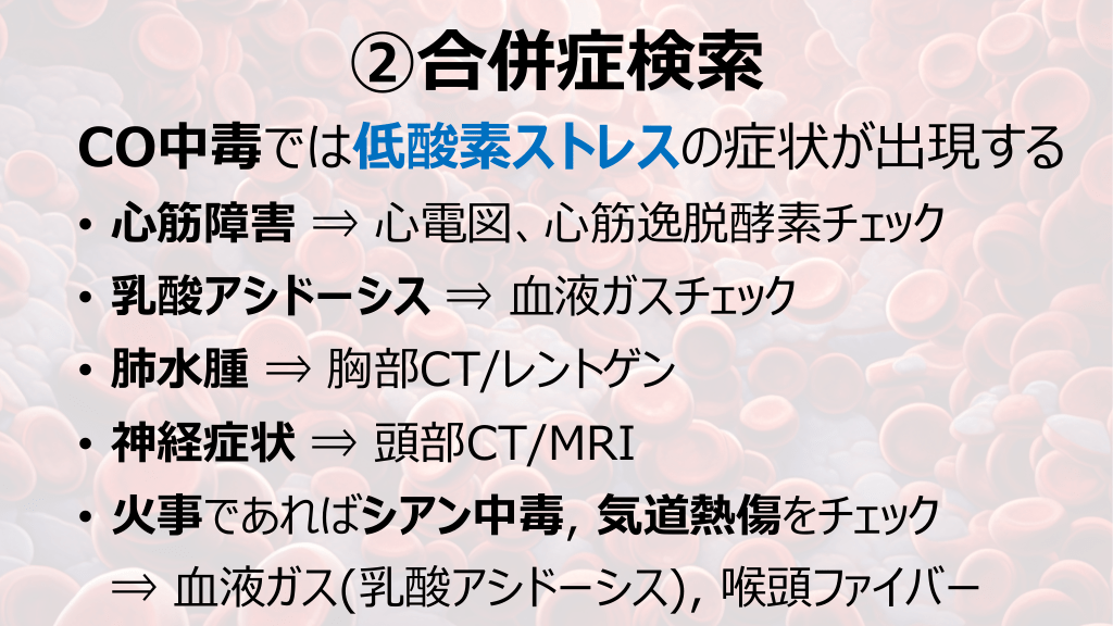 #12. ②合併症検索 CO中毒では低酸素ストレスの症状が出現する • ⼼筋障害 ⇒ ⼼電図、⼼筋逸脱酵素チェック • 乳酸アシドーシス ⇒ ⾎液ガスチェック • 肺⽔腫 ⇒ 胸部CT/レントゲン • 神経症状 ⇒ 頭部CT/MRI • ⽕事であればシアン中毒, 気道熱傷をチェック ⇒ ⾎液ガス(乳酸アシドーシス), 喉頭ファイバー