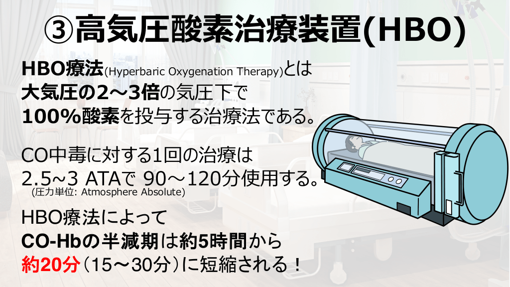 #13. ③⾼気圧酸素治療装置(HBO) HBO療法(Hyperbaric Oxygenation Therapy)とは ⼤気圧の2〜3倍の気圧下で 100%酸素を投与する治療法である。 CO中毒に対する1回の治療は 2.5~3 ATAで 90〜120分使⽤する。 (圧⼒単位: Atmosphere Absolute) HBO療法によって CO-Hbの半減期は約5時間から 約20分(15~30分)に短縮される!