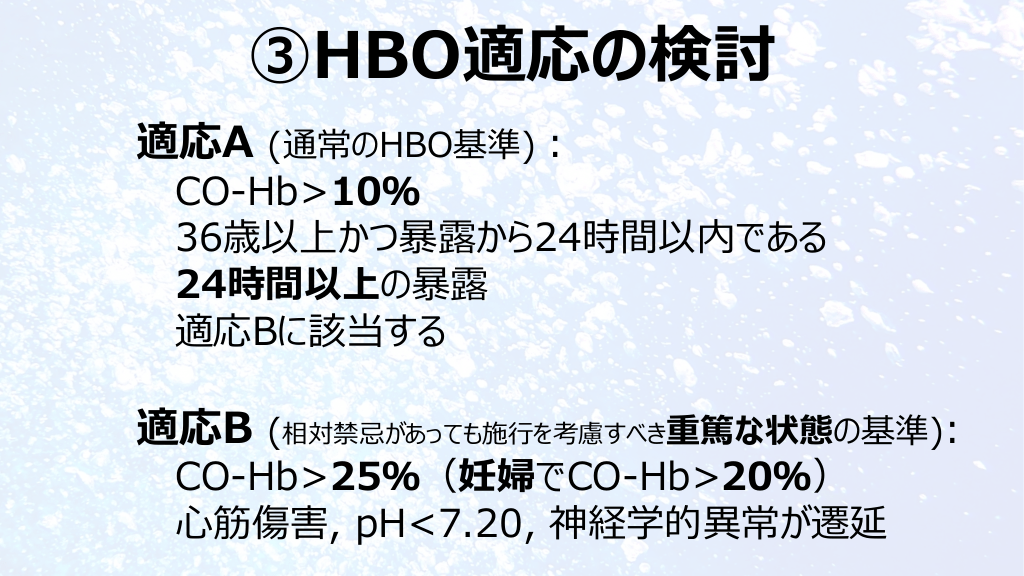 #14. ③HBO適応の検討 適応A (通常のHBO基準)︓ 適応B (相対禁忌があっても施⾏を考慮すべき重篤な状態の基準): CO-Hb>10% 36歳以上かつ暴露から24時間以内である 24時間以上の暴露 適応Bに該当する CO-Hb>25%(妊婦でCO-Hb>20%) ⼼筋傷害, pH<7.20, 神経学的異常が遷延