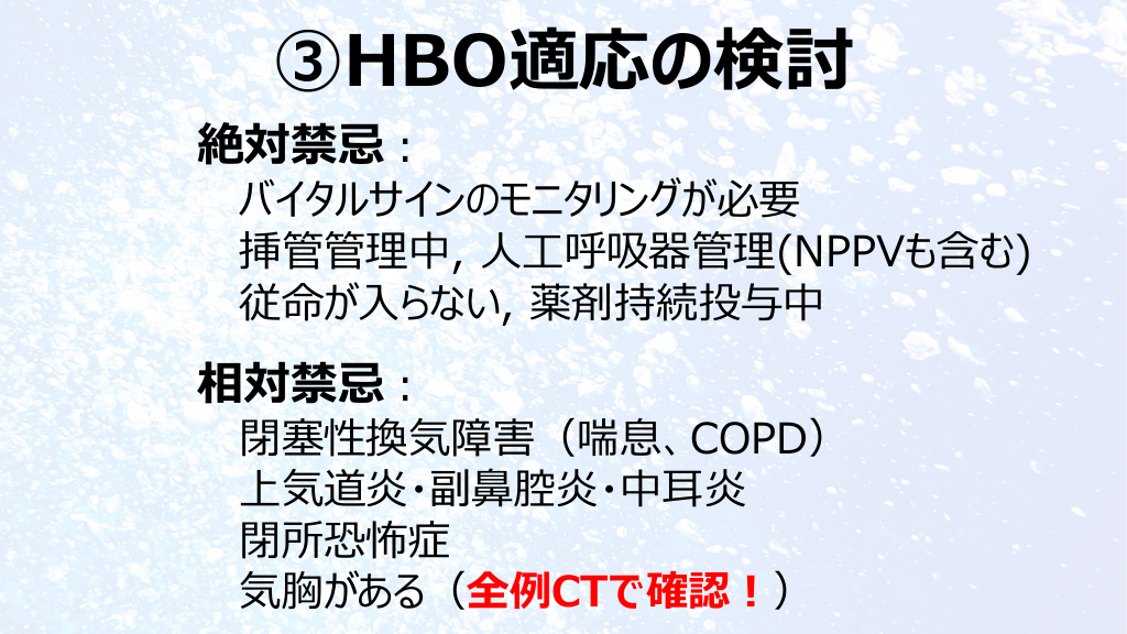 #15. ③HBO適応の検討 絶対禁忌︓ バイタルサインのモニタリングが必要 挿管管理中, ⼈⼯呼吸器管理(NPPVも含む) 従命が⼊らない, 薬剤持続投与中 相対禁忌︓ 閉塞性換気障害(喘息、COPD) 上気道炎・副⿐腔炎・中⽿炎 閉所恐怖症 気胸がある(全例CTで確認︕)