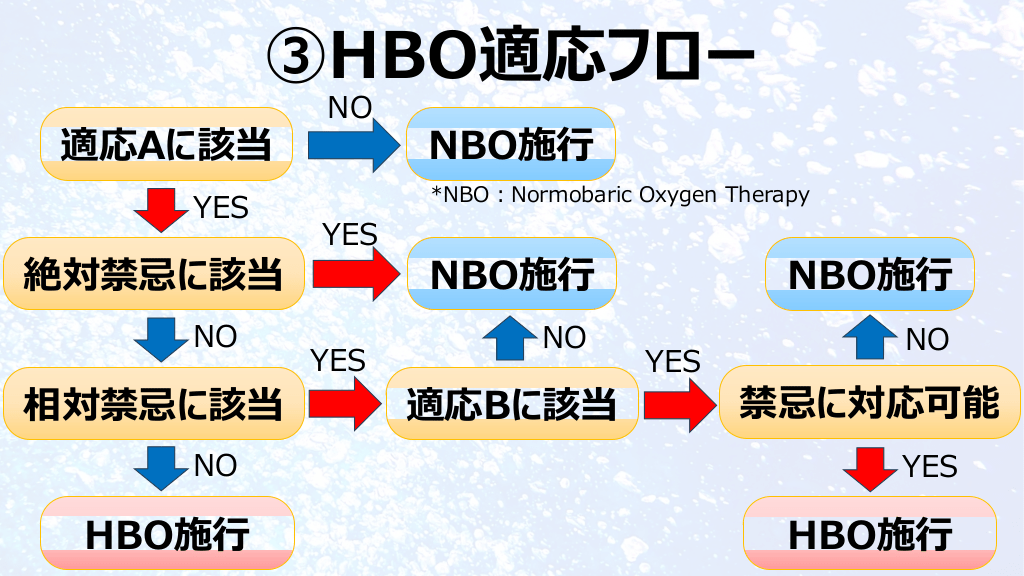#16. ③HBO適応フロー 適応Aに該当 YES 絶対禁忌に該当 NO 相対禁忌に該当 NO HBO施⾏ NO NBO施⾏ *NBO︓Normobaric Oxygen Therapy YES YES NBO施⾏ NBO施⾏ NO NO 適応Bに該当 YES 禁忌に対応可能 YES HBO施⾏