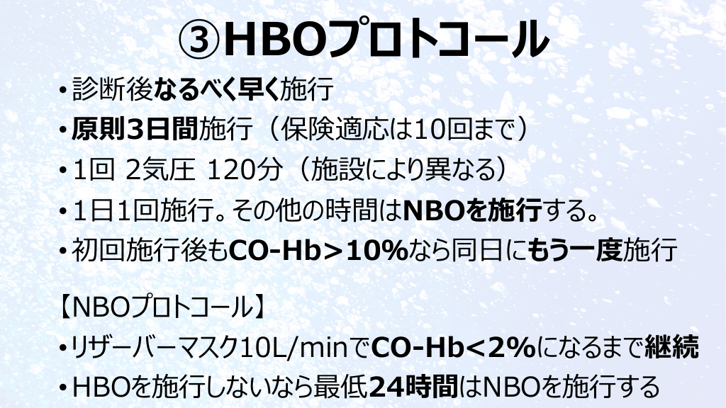 #17. ③HBOプロトコール • 診断後なるべく早く施⾏ • 原則3⽇間施⾏(保険適応は10回まで) • 1回 2気圧 120分(施設により異なる) • 1⽇1回施⾏。その他の時間はNBOを施⾏する。 • 初回施⾏後もCO-Hb>10%なら同⽇にもう⼀度施⾏ 【NBOプロトコール】 • リザーバーマスク10L/minでCO-Hb<2%になるまで継続 • HBOを施⾏しないなら最低24時間はNBOを施⾏する