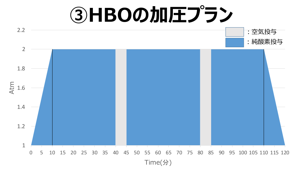 #18. ③HBOの加圧プラン 2.2 ︓空気投与 ︓純酸素投与 2 Atm 1.8 1.6 1.4 1.2 1 0 5 10 15 20 25 30 35 40 45 50 55 60 65 70 75 80 85 90 95 100 105 110 115 120 Time(分)