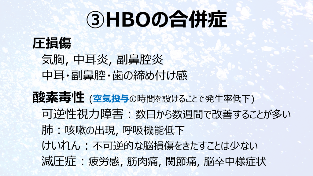 #19. ③HBOの合併症 圧損傷 気胸, 中⽿炎, 副⿐腔炎 中⽿・副⿐腔・⻭の締め付け感 酸素毒性 (空気投与の時間を設けることで発⽣率低下) 可逆性視⼒障害︓数⽇から数週間で改善することが多い 肺︓咳嗽の出現, 呼吸機能低下 けいれん︓不可逆的な脳損傷をきたすことは少ない 減圧症︓疲労感, 筋⾁痛, 関節痛, 脳卒中様症状