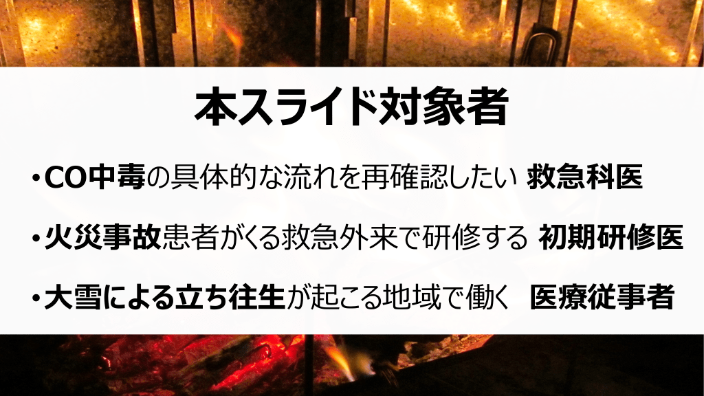 #2. 本スライド対象者 •CO中毒の具体的な流れを再確認したい 救急科医 •⽕災事故患者がくる救急外来で研修する 初期研修医 •⼤雪による⽴ち往⽣が起こる地域で働く 医療従事者