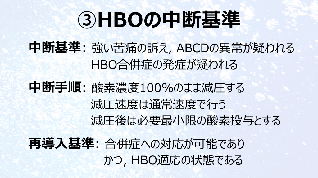 #20. ③HBOの中断基準 中断基準: 強い苦痛の訴え, ABCDの異常が疑われる HBO合併症の発症が疑われる 中断⼿順: 酸素濃度100%のまま減圧する 減圧速度は通常速度で⾏う 減圧後は必要最⼩限の酸素投与とする 再導⼊基準: 合併症への対応が可能であり かつ, HBO適応の状態である
