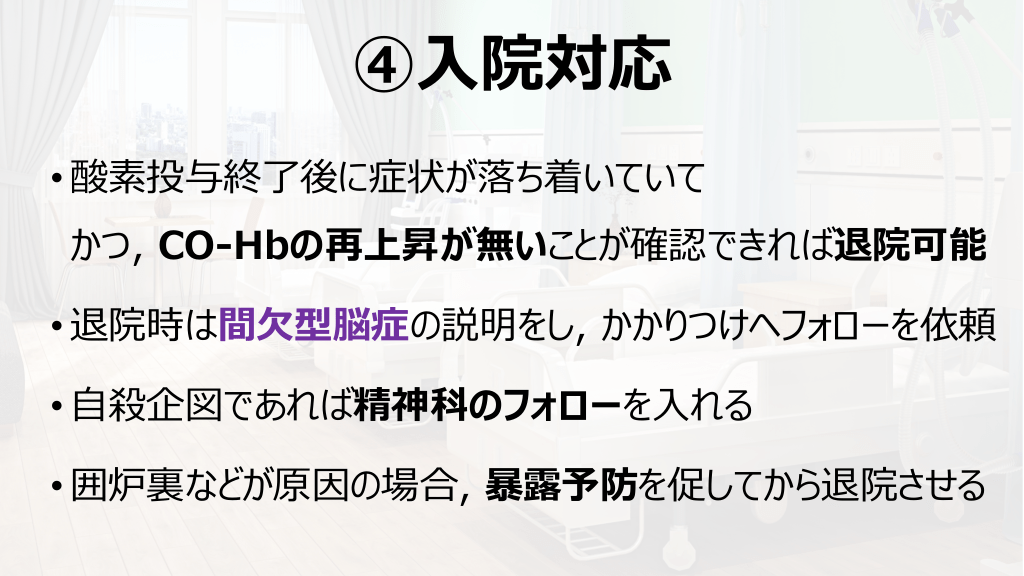 #21. ④⼊院対応 • 酸素投与終了後に症状が落ち着いていて かつ, CO-Hbの再上昇が無いことが確認できれば退院可能 • 退院時は間⽋型脳症の説明をし, かかりつけヘフォローを依頼 • ⾃殺企図であれば精神科のフォローを⼊れる • 囲炉裏などが原因の場合, 暴露予防を促してから退院させる