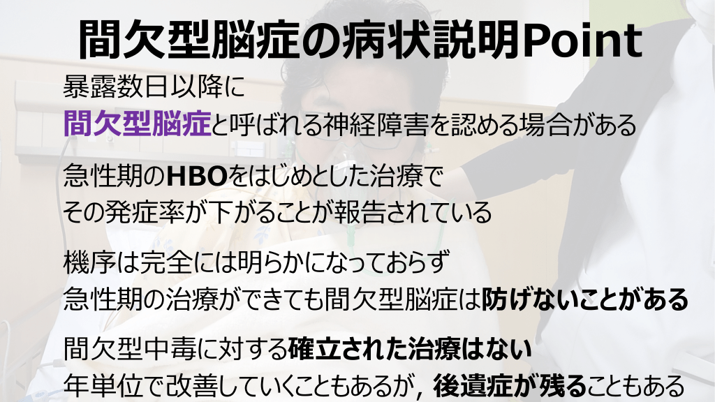 #22. 間⽋型脳症の病状説明Point 暴露数⽇以降に 間⽋型脳症と呼ばれる神経障害を認める場合がある 急性期のHBOをはじめとした治療で その発症率が下がることが報告されている 機序は完全には明らかになっておらず 急性期の治療ができても間⽋型脳症は防げないことがある 間⽋型中毒に対する確⽴された治療はない 年単位で改善していくこともあるが, 後遺症が残ることもある