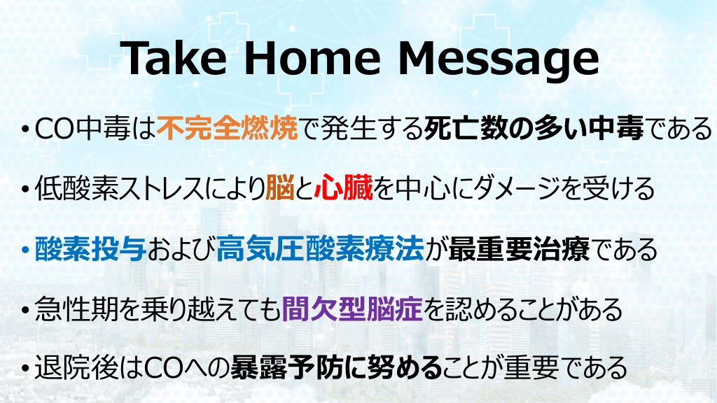 #23. Take Home Message • CO中毒は不完全燃焼で発⽣する死亡数の多い中毒である • 低酸素ストレスにより脳と⼼臓を中⼼にダメージを受ける • 酸素投与および⾼気圧酸素療法が最重要治療である • 急性期を乗り越えても間⽋型脳症を認めることがある • 退院後はCOへの暴露予防に努めることが重要である