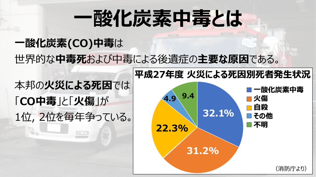 #3. ⼀酸化炭素中毒とは ⼀酸化炭素(CO)中毒は 世界的な中毒死および中毒による後遺症の主要な原因である。 本邦の⽕災による死因では 「CO中毒」と「⽕傷」が 1位, 2位を毎年争っている。 (消防庁より)