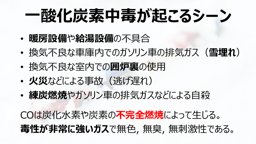 #4. ⼀酸化炭素中毒が起こるシーン • • • • • 暖房設備や給湯設備の不具合 換気不良な⾞庫内でのガソリン⾞の排気ガス(雪埋れ) 換気不良な室内での囲炉裏の使⽤ ⽕災などによる事故(逃げ遅れ) 練炭燃焼やガソリン⾞の排気ガスなどによる⾃殺 COは炭化⽔素や炭素の不完全燃焼によって⽣じる。 毒性が⾮常に強いガスで無⾊, 無臭, 無刺激性である。