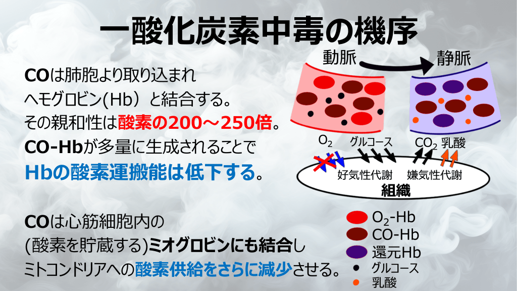 #5. ⼀酸化炭素中毒の機序 COは肺胞より取り込まれ ヘモグロビン(Hb)と結合する。 その親和性は酸素の200〜250倍。 CO-Hbが多量に⽣成されることで Hbの酸素運搬能は低下する。 COは⼼筋細胞内の (酸素を貯蔵する)ミオグロビンにも結合し ミトコンドリアヘの酸素供給をさらに減少させる。