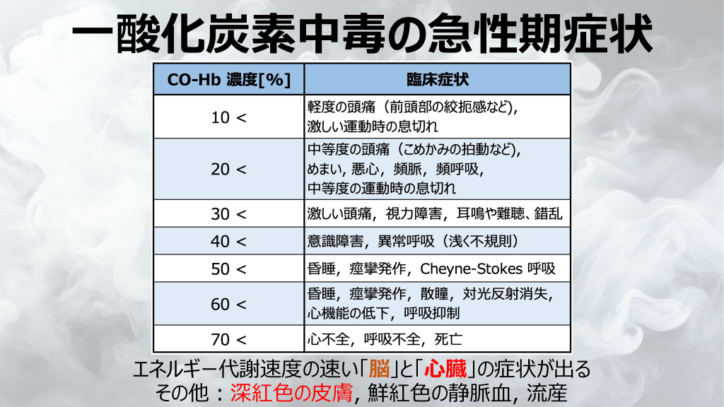 #6. ⼀酸化炭素中毒の急性期症状 エネルギー代謝速度の速い「脳」と「⼼臓」の症状が出る その他︓深紅⾊の⽪膚, 鮮紅⾊の静脈⾎, 流産