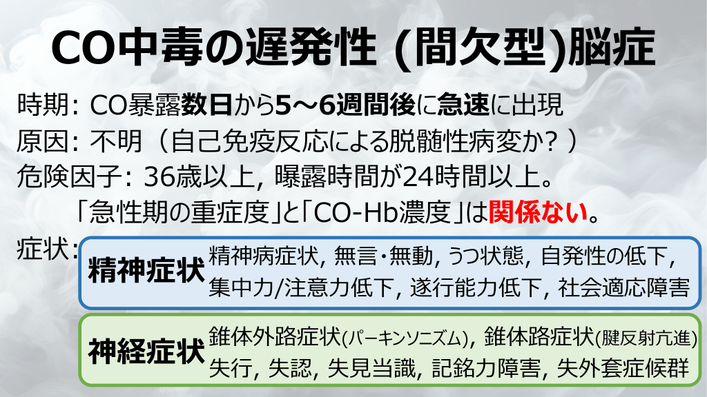 #7. CO中毒の遅発性 (間⽋型)脳症 時期: CO暴露数⽇から5〜6週間後に急速に出現 原因: 不明(⾃⼰免疫反応による脱髄性病変か? ) 危険因⼦: 36歳以上, 曝露時間が24時間以上。 「急性期の重症度」と「CO-Hb濃度」は関係ない。 症状: 精神病症状, 無⾔・無動, うつ状態, ⾃発性の低下, 精神症状 集中⼒/注意⼒低下, 遂⾏能⼒低下, 社会適応障害 錐体外路症状(パーキンソニズム), 錐体路症状(腱反射亢進) 神経症状 失⾏, 失認, 失⾒当識, 記銘⼒障害, 失外套症候群