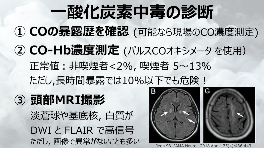 #8. ⼀酸化炭素中毒の診断 ① COの暴露歴を確認 (可能なら現場のCO濃度測定) ② CO-Hb濃度測定 (パルスCOオキシメータ を使⽤) 正常値︓⾮喫煙者<2%, 喫煙者 5〜13% ただし,⻑時間暴露では10%以下でも危険︕ ③ 頭部MRI撮影 淡蒼球や基底核, ⽩質が DWI と FLAIR で⾼信号 ただし, 画像で異常がないことも多い Jeon SB. JAMA Neurol. 2018 Apr 1;75(4):436-443.