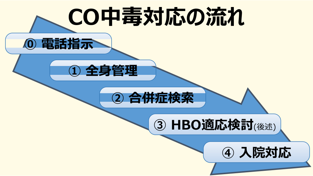#9. CO中毒対応の流れ ⓪ 電話指⽰ ① 全⾝管理 ② 合併症検索 ③ HBO適応検討(後述) ④ ⼊院対応