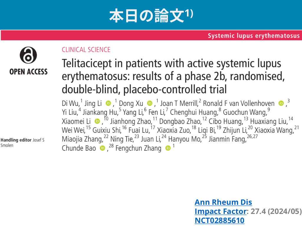 Wu D, Li J, Xu D et al. Telitacicept in patients with active systemic lupus erythematosus: results of a phase 2b, randomised, double-blind, placebo-controlled trial. Ann Rheum Dis. 2024 Mar 12;83(4):475-487.