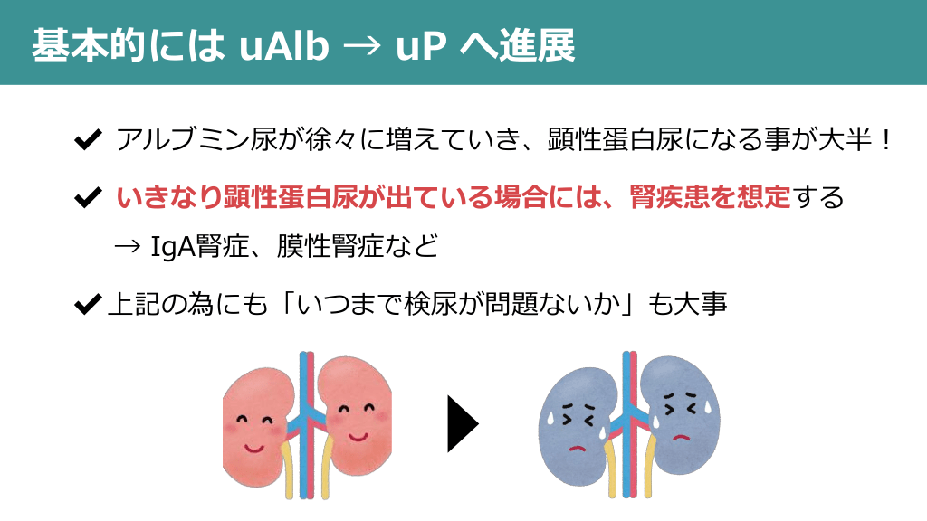 #10. 基本的には uAlb → uP へ進展 ✔ アルブミン尿が徐々に増えていき、顕性蛋白尿になる事が大半! ✔ いきなり顕性蛋白尿が出ている場合には、腎疾患を想定する → IgA腎症、膜性腎症など ✔上記の為にも「いつまで検尿が問題ないか」も大事