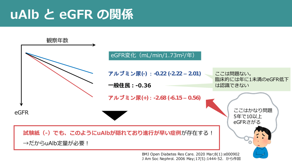 #11. uAlb と eGFR の関係 観察年数 eGFR変化(mL/min/1.73m2/年) アルブミン尿(-) :-0.22 (-2.22 – 2.01) 一般住民:-0.36 ここは問題ない。 臨床的には年に1未満のeGFR低下 は認識できない アルブミン尿(+):-2.68 (-6.15 – 0.56) ここはかなり問題 5年で10以上 eGFRさがる eGFR 試験紙(-)でも、このようにuAlbが隠れており進行が早い症例が存在する! →だからuAlb定量が必要! BMJ Open Diabetes Res Care. 2020 Mar;8(1):e000902 J Am Soc Nephrol. 2006 May;17(5):1444-52. から作図