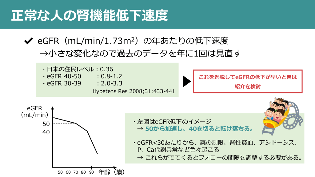 #12. 正常な人の腎機能低下速度 ✔ eGFR(mL/min/1.73m2)の年あたりの低下速度 →小さな変化なので過去のデータを年に1回は見直す ・日本の住民レベル:0.36 ・eGFR 40-50 :0.8-1.2 ・eGFR 30-39 :2.0-3.3 これを逸脱してeGFRの低下が早いときは Hypetens Res 2008;31:433-441 eGFR (mL/min) 紹介を検討 ・左図はeGFR低下のイメージ → 50から加速し、40を切ると転げ落ちる。 50 40 ・eGFR<30あたりから、薬の制限、腎性貧血、アシドーシス、 P、Ca代謝異常など色々起こる → これらがでてくるとフォローの間隔を調整する必要がある。 50 60 70 80 90 年齢(歳)
