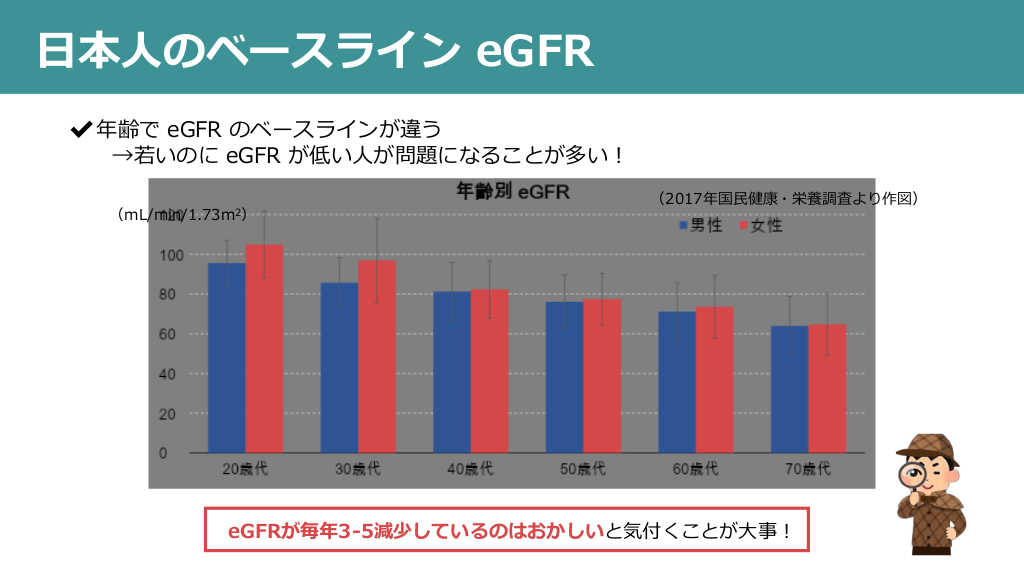 #13. 日本人のベースライン eGFR ✔年齢で eGFR のベースラインが違う →若いのに eGFR が低い人が問題になることが多い! (mL/min/1.73m2) (2017年国民健康・栄養調査より作図) eGFRが毎年3-5減少しているのはおかしいと気付くことが大事!