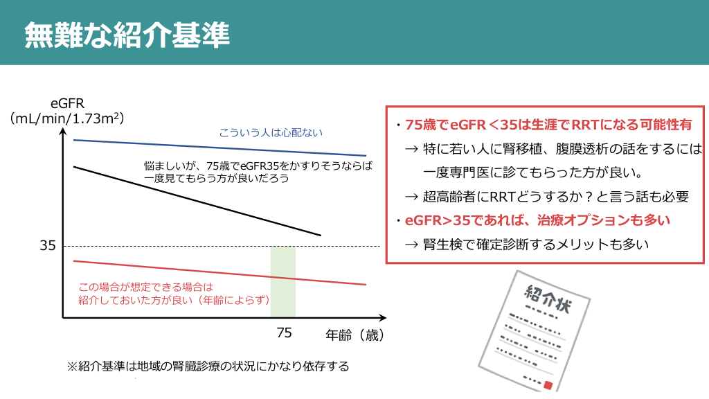 #14. 無難な紹介基準 eGFR (mL/min/1.73m2) ・75歳でeGFR<35は生涯でRRTになる可能性有 こういう人は心配ない → 特に若い人に腎移植、腹膜透析の話をするには 悩ましいが、75歳でeGFR35をかすりそうならば 一度見てもらう方が良いだろう 一度専門医に診てもらった方が良い。 → 超高齢者にRRTどうするか?と言う話も必要 ・eGFR>35であれば、治療オプションも多い → 腎生検で確定診断するメリットも多い 35 この場合が想定できる場合は 紹介しておいた方が良い(年齢によらず) 75 年齢(歳) ※紹介基準は地域の腎臓診療の状況にかなり依存する