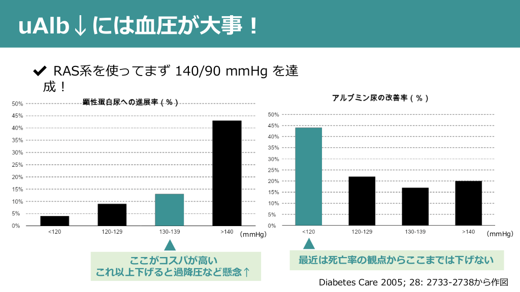 #16. uAlb↓には血圧が大事! ✔ RAS系を使ってまず 140/90 mmHg を達 成! (mmHg) ここがコスパが高い これ以上下げると過降圧など懸念↑ (mmHg) 最近は死亡率の観点からここまでは下げない Diabetes Care 2005; 28: 2733-2738から作図