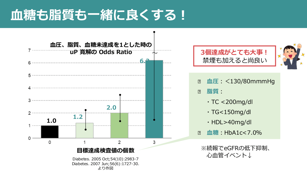 #17. 血糖も脂質も一緒に良くする! 血圧、脂質、血糖未達成を1とした時の uP 寛解の Odds Ratio 〜 6.2 3個達成がとても大事! 禁煙も加えると尚良い 🞐 血圧:<130/80mmmHg 🞐 脂質: ・TC <200mg/dl 2.0 1.0 ・TG<150mg/dl 1.2 ・HDL>40mg/dl 🞐 目標達成検査値の個数 Diabetes. 2005 Oct;54(10):2983-7 Diabetes. 2007 Jun;56(6):1727-30. より作図 血糖:HbA1c<7.0% ※続報でeGFRの低下抑制、 心血管イベント↓