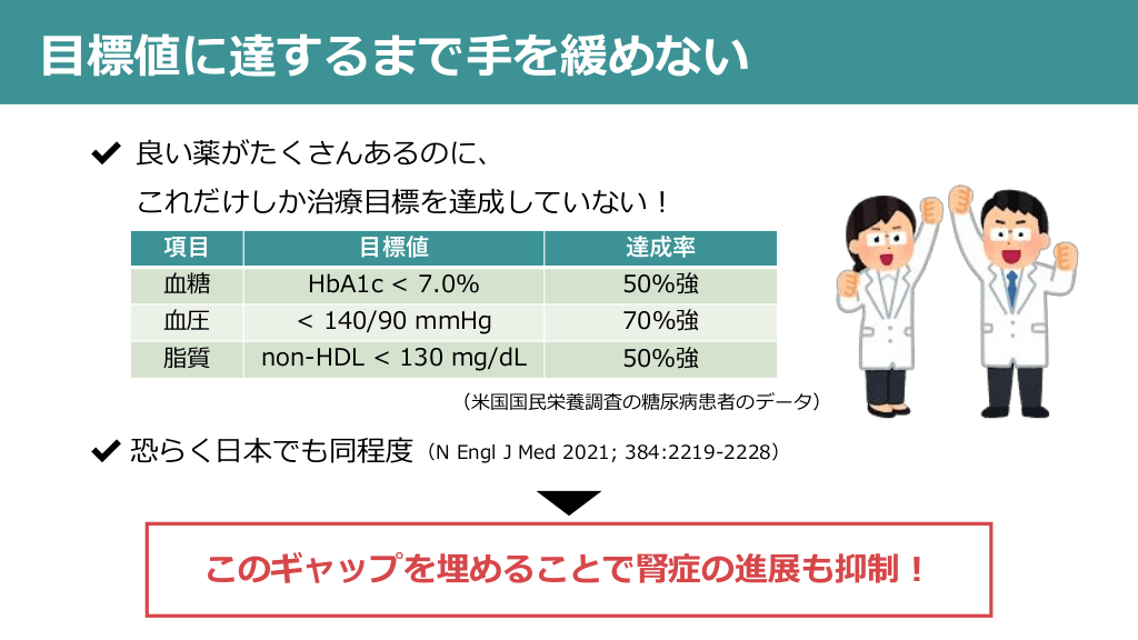 #18. 目標値に達するまで手を緩めない ✔ 良い薬がたくさんあるのに、 ✔ これだけしか治療目標を達成していない! 項目 目標値 達成率 血糖 HbA1c < 7.0% 50%強 血圧 < 140/90 mmHg 70%強 脂質 non-HDL < 130 mg/dL 50%強 (米国国民栄養調査の糖尿病患者のデータ) ✔ 恐らく日本でも同程度 (N Engl J Med 2021; 384:2219-2228) このギャップを埋めることで腎症の進展も抑制!