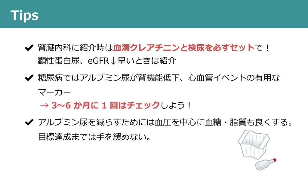 #20. Tips ✔ 腎臓内科に紹介時は血清クレアチニンと検尿を必ずセットで! ✔ 顕性蛋白尿、eGFR↓早いときは紹介 ✔ 糖尿病ではアルブミン尿が腎機能低下、心血管イベントの有用な ✔ マーカー → 3~6 か月に 1 回はチェックしよう! ✔ アルブミン尿を減らすためには血圧を中心に血糖・脂質も良くする。 ✔ 目標達成までは手を緩めない。
