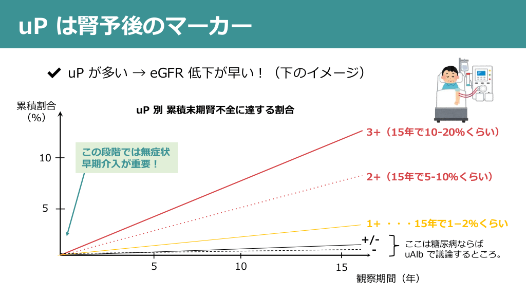 #4. uP は腎予後のマーカー ✔ uP が多い → eGFR 低下が早い!(下のイメージ) 累積割合 (%) uP 別 累積末期腎不全に達する割合 3+(15年で10-20%くらい) 10 この段階では無症状 早期介入が重要! 2+(15年で5-10%くらい) 5 1+ ・・・15年で1−2%くらい +/5 10 15 ここは糖尿病ならば uAlb で議論するところ。 観察期間(年)