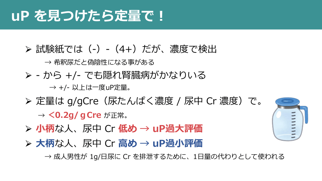 #5. uP を見つけたら定量で! ⮚ 試験紙では(-)-(4+)だが、濃度で検出 → 希釈尿だと偽陰性になる事がある ⮚ - から +/- でも隠れ腎臓病がかなりいる → +/- 以上は一度uP定量。 ⮚ 定量は g/gCre(尿たんぱく濃度 / 尿中 Cr 濃度)で。 → <0.2g/gCre が正常。 ⮚ 小柄な人、尿中 Cr 低め → uP過大評価 ⮚ 大柄な人、尿中 Cr 高め → uP過小評価 → 成人男性が 1g/日尿に Cr を排泄するために、1日量の代わりとして使われる