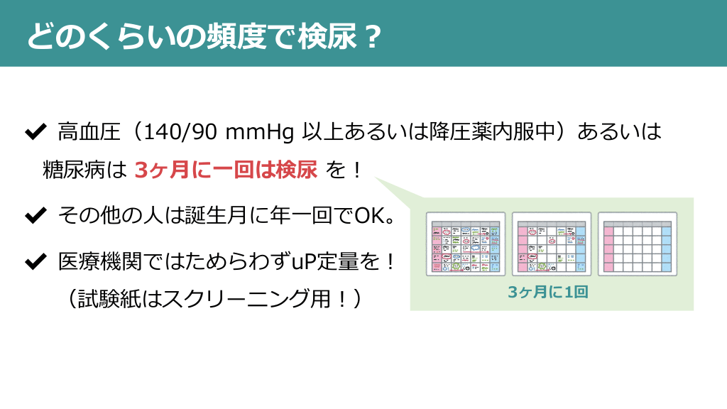 #6. どのくらいの頻度で検尿? ✔ 高血圧(140/90 mmHg 以上あるいは降圧薬内服中)あるいは 糖尿病は 3ヶ月に一回は検尿 を! ✔ その他の人は誕生月に年一回でOK。 ✔ 医療機関ではためらわずuP定量を! (試験紙はスクリーニング用!) 3ヶ月に1回