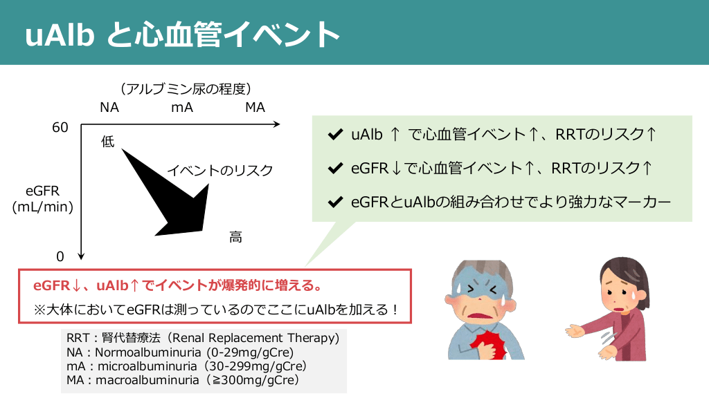 #9. uAlb と心血管イベント (アルブミン尿の程度) NA mA MA 60 ✔ uAlb ↑ で心血管イベント↑、RRTのリスク↑ 低 イベントのリスク eGFR (mL/min) ✔ eGFR↓で心血管イベント↑、RRTのリスク↑ ✔ eGFRとuAlbの組み合わせでより強力なマーカー 高 0 eGFR↓、uAlb↑でイベントが爆発的に増える。 ※大体においてeGFRは測っているのでここにuAlbを加える! RRT:腎代替療法(Renal Replacement Therapy) NA:Normoalbuminuria (0-29mg/gCre) mA:microalbuminuria(30-299mg/gCre) MA:macroalbuminuria(≧300mg/gCre)