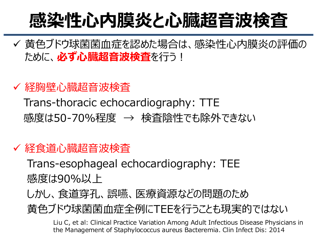 #10. 感染性心内膜炎と心臓超音波検査 黄色ブドウ球菌菌血症を認めた場合は、感染性心内膜炎の評価の ために、必ず心臓超音波検査を行う! 経胸壁心臓超音波検査 Trans-thoracic echocardiography: TTE 感度は50-70%程度 → 検査陰性でも除外できない 経食道心臓超音波検査 Trans-esophageal echocardiography: TEE 感度は90%以上 しかし、食道穿孔、誤嚥、医療資源などの問題のため 黄色ブドウ球菌菌血症全例にTEEを行うことも現実的ではない Liu C, et al: Clinical Practice Variation Among Adult Infectious Disease Physicians in the Management of Staphylococcus aureus Bacteremia. Clin Infect Dis: 2014
