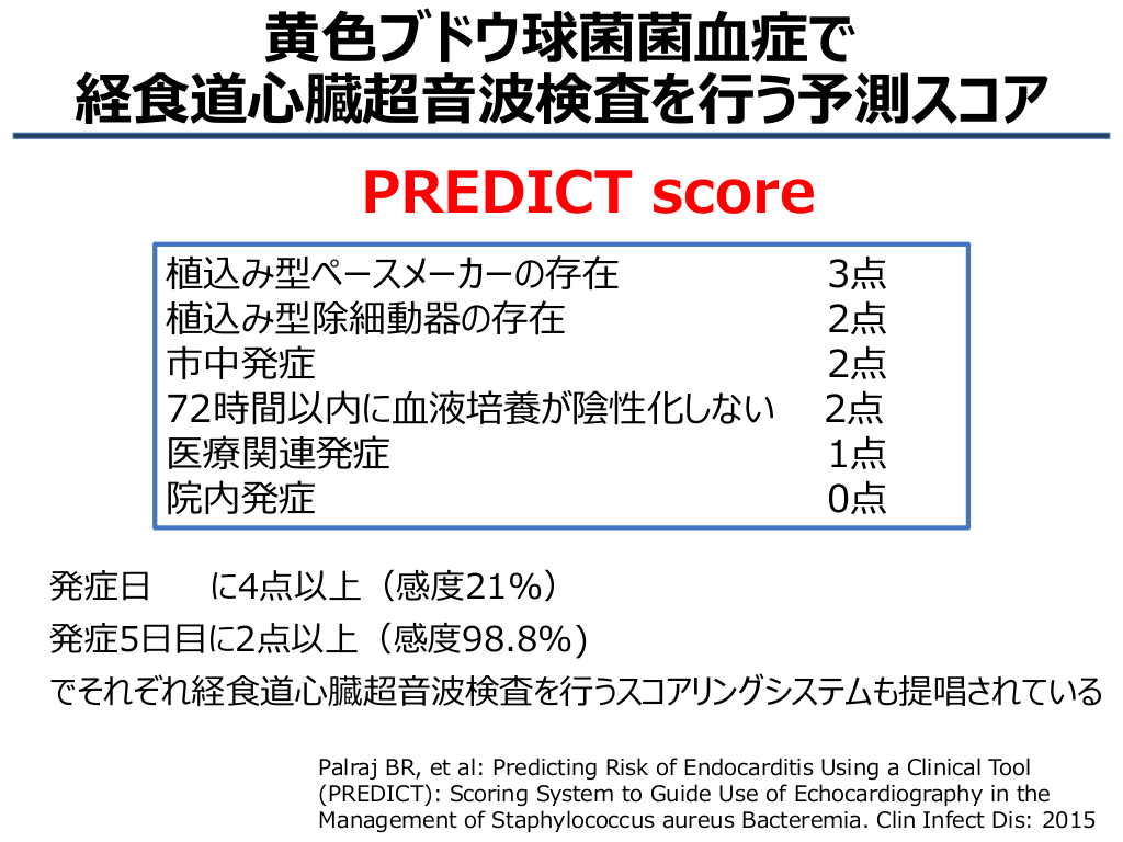 #11. 黄色ブドウ球菌菌血症で 経食道心臓超音波検査を行う予測スコア PREDICT score 植込み型ペースメーカーの存在 植込み型除細動器の存在 市中発症 72時間以内に血液培養が陰性化しない 医療関連発症 院内発症 発症日 3点 2点 2点 2点 1点 0点 に4点以上(感度21%) 発症5日目に2点以上(感度98.8%) でそれぞれ経食道心臓超音波検査を行うスコアリングシステムも提唱されている Palraj BR, et al: Predicting Risk of Endocarditis Using a Clinical Tool (PREDICT): Scoring System to Guide Use of Echocardiography in the Management of Staphylococcus aureus Bacteremia. Clin Infect Dis: 2015