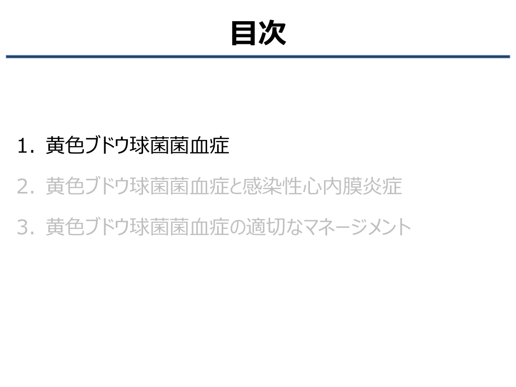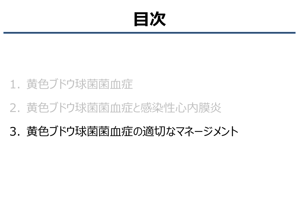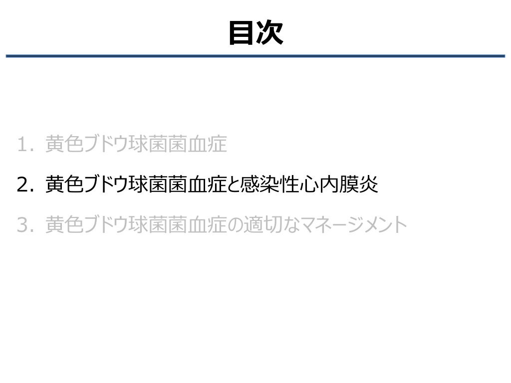 #3. 目次 1. 黄色ブドウ球菌菌血症 2. 黄色ブドウ球菌菌血症と感染性心内膜炎症 3. 黄色ブドウ球菌菌血症の適切なマネージメント