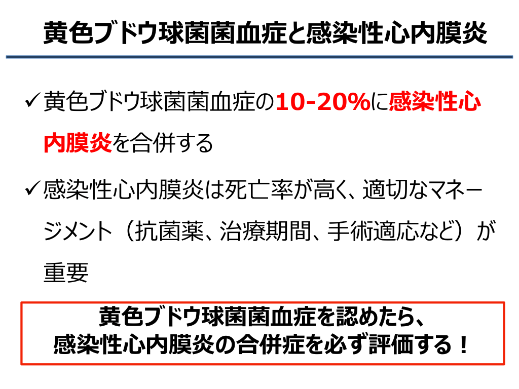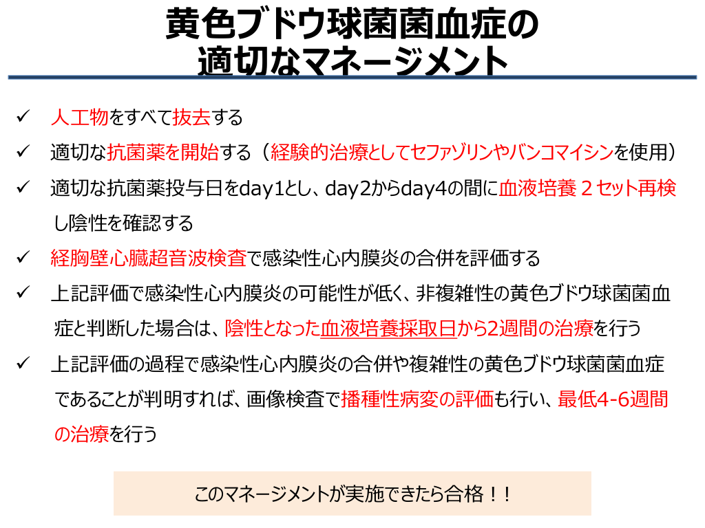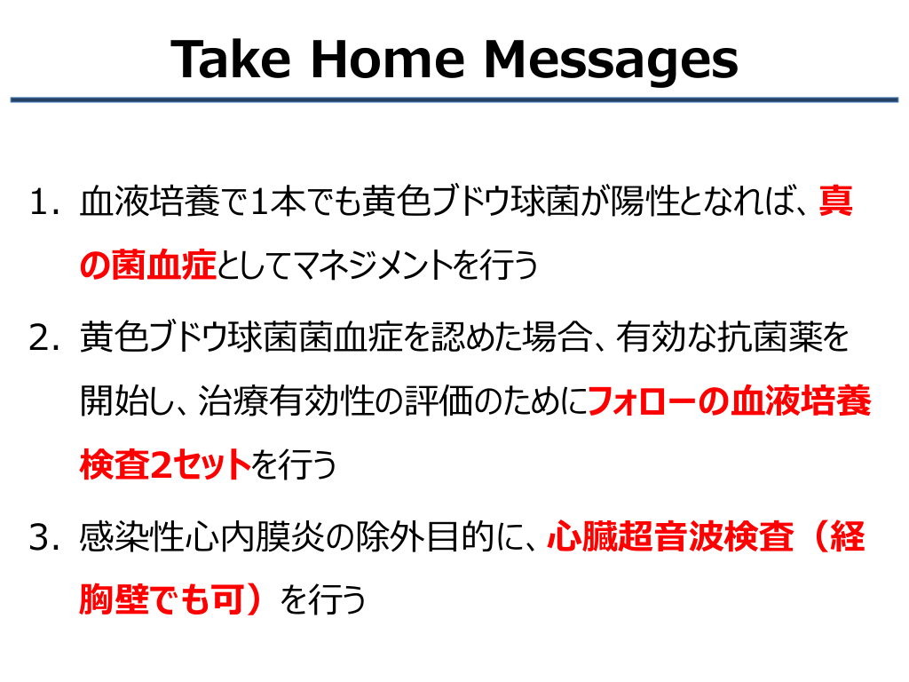#2. Take Home Messages 1. 血液培養で1本でも黄色ブドウ球菌が陽性となれば、真 の菌血症としてマネジメントを行う 2. 黄色ブドウ球菌菌血症を認めた場合、有効な抗菌薬を 開始し、治療有効性の評価のためにフォローの血液培養 検査2セットを行う 3. 感染性心内膜炎の除外目的に、心臓超音波検査(経 胸壁でも可)を行う