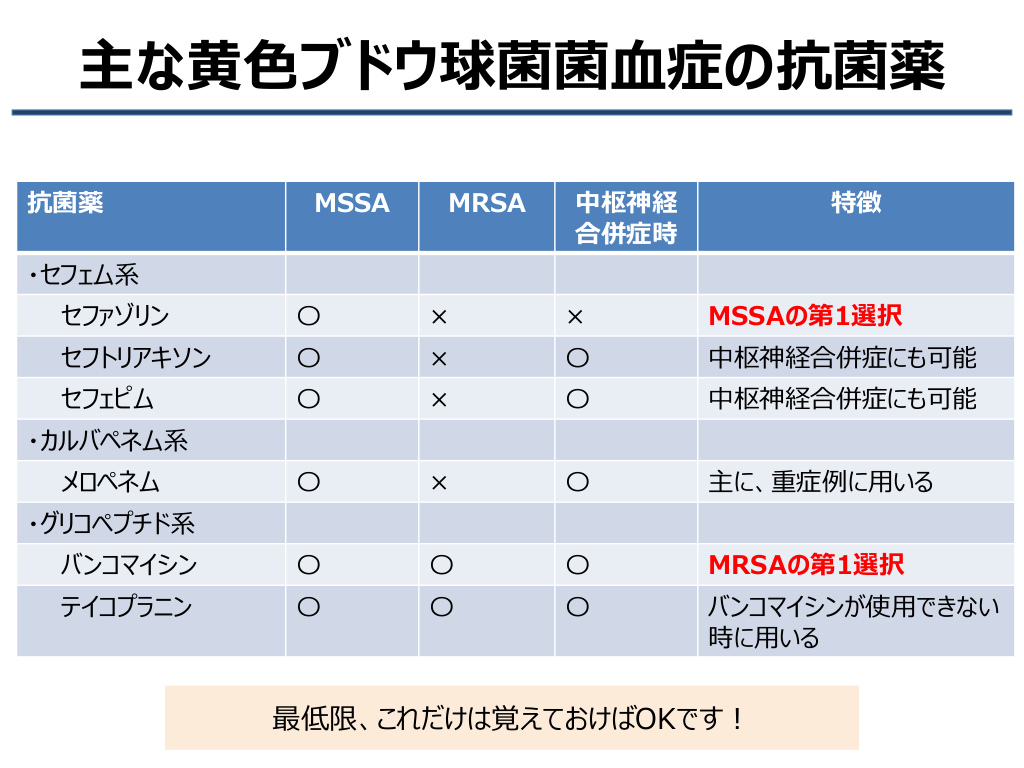 #15. 主な黄色ブドウ球菌菌血症の抗菌薬 抗菌薬 MSSA MRSA 中枢神経 合併症時 特徴 ・セフェム系 セファゾリン 〇 × × MSSAの第1選択 セフトリアキソン 〇 × 〇 中枢神経合併症にも可能 セフェピム 〇 × 〇 中枢神経合併症にも可能 〇 × 〇 主に、重症例に用いる バンコマイシン 〇 〇 〇 MRSAの第1選択 テイコプラニン 〇 〇 〇 バンコマイシンが使用できない 時に用いる ・カルバペネム系 メロペネム ・グリコペプチド系 最低限、これだけは覚えておけばOKです!