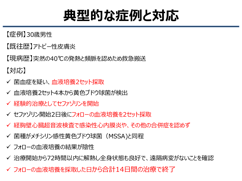 #16. 典型的な症例と対応 【症例】30歳男性 【既往歴】アトピー性皮膚炎 【現病歴】突然の40℃の発熱と頻脈を認めため救急搬送 【対応】 菌血症を疑い、血液培養2セット採取 血液培養2セット4本から黄色ブドウ球菌が検出 経験的治療としてセファゾリンを開始 セファゾリン開始2日後にフォローの血液培養を2セット採取 経胸壁心臓超音波検査で感染性心内膜炎や、その他の合併症を認めず 菌種がメチシリン感性黄色ブドウ球菌(MSSA)と同程 フォローの血液培養の結果が陰性 治療開始から72時間以内に解熱し全身状態も良好で、遠隔病変がないことを確認 フォローの血液培養を採取した日から合計14日間の治療で終了