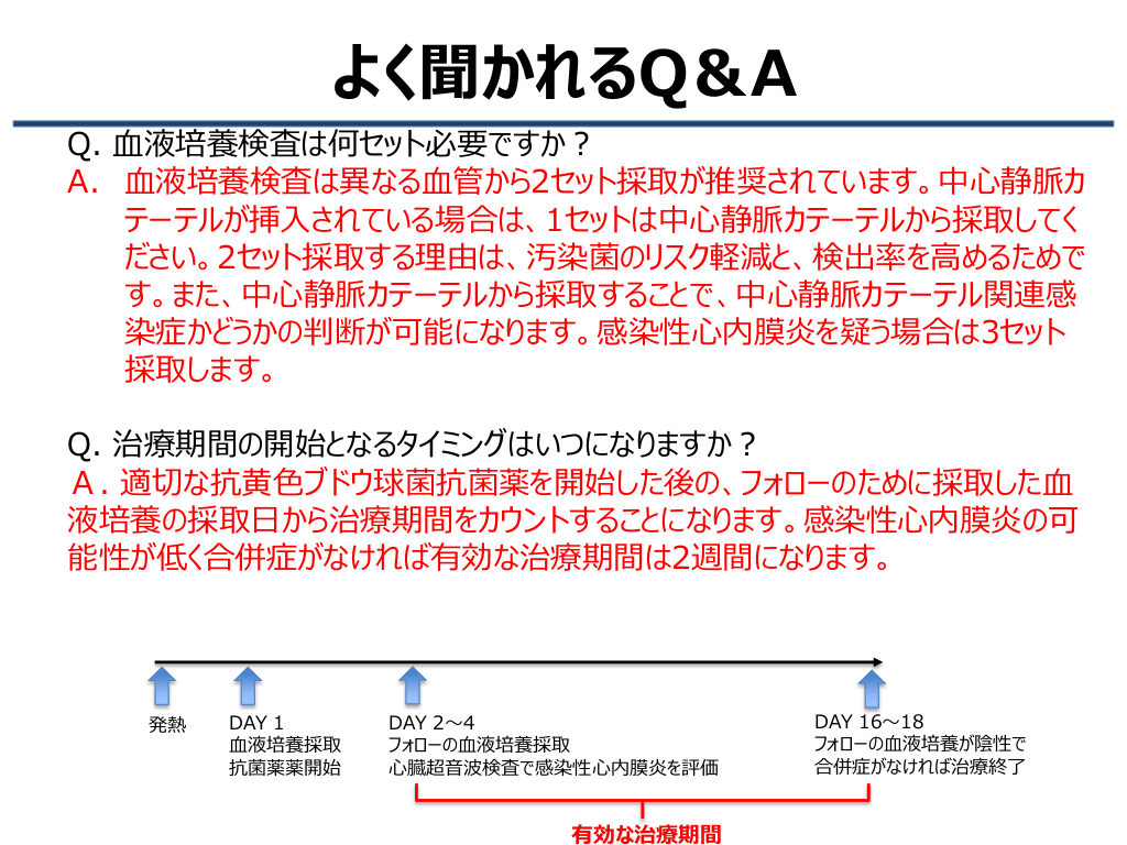 #17. よく聞かれるQ&A Q. 血液培養検査は何セット必要ですか? A. 血液培養検査は異なる血管から2セット採取が推奨されています。中心静脈カ テーテルが挿入されている場合は、1セットは中心静脈カテーテルから採取してく ださい。2セット採取する理由は、汚染菌のリスク軽減と、検出率を高めるためで す。また、中心静脈カテーテルから採取することで、中心静脈カテーテル関連感 染症かどうかの判断が可能になります。感染性心内膜炎を疑う場合は3セット 採取します。 Q. 治療期間の開始となるタイミングはいつになりますか? A. 適切な抗黄色ブドウ球菌抗菌薬を開始した後の、フォローのために採取した血 液培養の採取日から治療期間をカウントすることになります。感染性心内膜炎の可 能性が低く合併症がなければ有効な治療期間は2週間になります。 発熱 DAY 1 血液培養採取 抗菌薬薬開始 DAY 2~4 フォローの血液培養採取 心臓超音波検査で感染性心内膜炎を評価 有効な治療期間 DAY 16~18 フォローの血液培養が陰性で 合併症がなければ治療終了